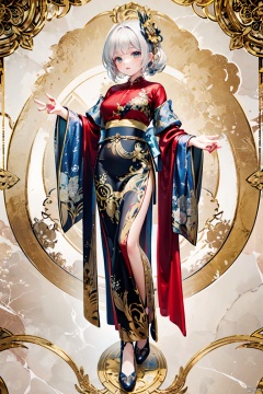 official art, unity 8k wallpaper, ultra detailed, beautiful and aesthetic, beautiful, masterpiece, best quality, (zentangle, mandala, tangle, entangle:0.4) The artwork features a fantasy chinese empress with the most sumptuous wedding hanfu dress made of (red silk:1.8) and richly embroidered with gold and silver threads, intricately carved golden badges and tassels, very large sleeves, golden jewels, along with an assortment of different floral patterns spread throughout. Finely intricated magic circles, (Intricately carved marble background:1.8). (woman, very long hair, full body shot, majestic pose ) ,horror