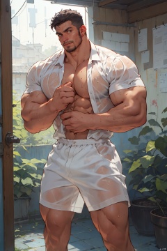 best quality, amazing quality, very aesthetic, absurdres, Best quality, masterpiece, ultra high res, detailed background, game_cg, muscular male, mature male, male focus, bara, bara daddy, facial_hair, thick thighs, thick arms, Wearing a wet white shirt, translucent clothes, looking at viewer, sweat, There is a beautiful scenery outside the window,