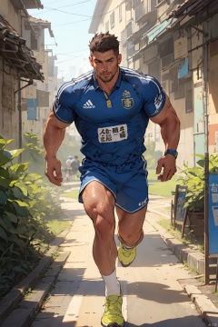 best quality, amazing quality, very aesthetic, absurdres, 1man, muscular male, in station, marathon uniform, sweat, busy, open clothes, chest hair, full body, bare pectorals, running