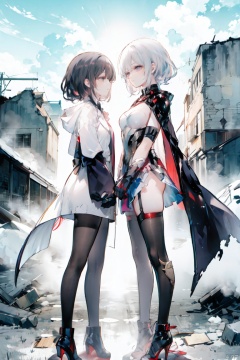 A couple of superhero bearded and woman looking each other in love between a battle scene, marvel like, standing at the ruined city, depth of field, cinematic