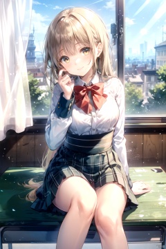 1girl, solo, long_hair, looking_at_viewer, blush, smile, bangs, skirt, blonde_hair, long_sleeves, bow, brown_eyes, sitting, very_long_hair, closed_mouth, school_uniform, yellow_eyes, white_shirt, pleated_skirt, collared_shirt, indoors, bowtie, red_bow, head_tilt, plaid, window, dress_shirt, feet_out_of_frame, plaid_skirt, sunlight, light_brown_hair, curtains, red_bowtie, desk, backlighting, hand_in_own_hair, brown_skirt, shirt_tucked_in, school_desk, on_desk, sitting_on_desk