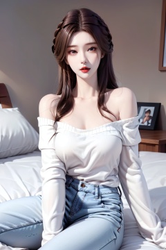 1girl, solo, pants, brown eyes, looking at viewer, red lips, brown hair, long hair, breasts, shirt, denim, sitting, jeans, off shoulder, collarbone, black shirt, indoors, parted lips, long sleeves, white pants, makeup, lipstick, medium breasts, sleeves past wrists, bed, shirt tucked in, on bed, bare shoulders