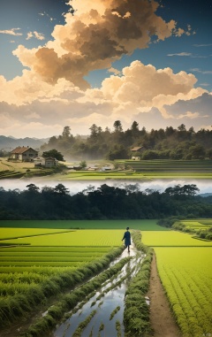 An old farmer carries a flat burden, Walk the winding roads of the countryside, Big clouds, blue sky, rice fields, There are neat rice seedlings in the field, forest, Hillside, Quiet, Rural area, HD Detail, Hyperdetail, Cinematic, Surrealism, Soft Light, Deep Field Focus Bokeh, Ray Tracing, and Surrealism,cloud,jianzhi