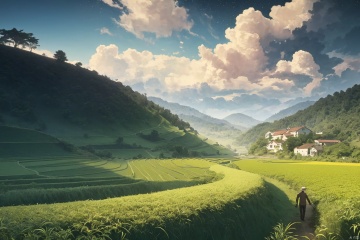 An old farmer carries a flat burden, Walk the winding roads of the countryside, Big clouds, blue sky, rice fields, There are neat rice seedlings in the field, forest, Hillside, Quiet, Rural area, HD Detail, Hyperdetail, Cinematic, Surrealism, Soft Light, Deep Field Focus Bokeh, Ray Tracing, and Surrealism,cloud,jianzhi