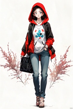 ooyama Kazuha, 1girl, solo, 1girl, hood, solo, long hair, pants, jeans, denim, red hair, shoes, hood up, full body, black footwear, sleeves past wrists, bag, walking, simple background, hoodie, standing, white background, looking at viewer, necklace, long sleeves, jewelry, wavy hair, conan, HTTP, 褰╄壊澶栧, 澶栧, colors, backlight,ooyama Kazuha,
