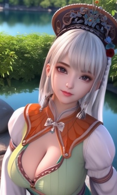 (,1girl, ,best quality, ),looking at viewer, <lora:433-DA-少年歌行-小白:0.8> ,ultra detailed 8k cg, ultra detailed background,  ,masterpiece, (( , )) , lake,upper body,   (cleavage), (),