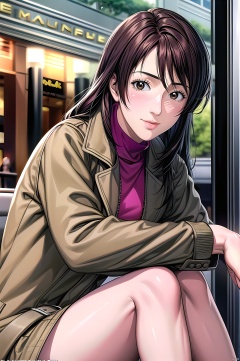 Xiangying, 1girl, long hair, turtleneck, brown hair, brown eyes, solo, coat, smile, jacket, solo focus, cowboy_shot,outdoors,(mall,sitting:1.5),nice hands, Beautiful long legs,  Beautiful body,  Beautiful character design, perfect balance,  looking at viewer,  official art,  extremely detailed CG unity 8k wallpaper,  perfect lighting,  Colorful,  White skin,  (masterpiece:1),  (best_quality:1),  ultra high res,  4K,  ultra-detailed,  photography,  8K,  HDR,  highres,  absurdres:1.2,  Kodak portra 400,  film grain,  blurry background,  bokeh:1.2,  lens flare,  (vibrant_color:1.2),  professional photograph,  (beautiful_face:1.5),  (narrow_waist),  dark studio, , Xiangying, dark studio