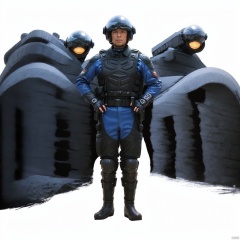 (masterpiece:1.3),(the best quality:1.2),(super fine illustrations:1.2),(Masterpiece),high quality,high detail,(white background:1.2),looking at viewer,(SOLO:1.4),outline,simple background,fullbody,, collar,choker,belt,military uniform,logo,armor,uniform,jacket,helmet,fingerless gloves,gloves,boots,emblem,pants,bodysuit,belt pouch,armband,military,blue jacket,