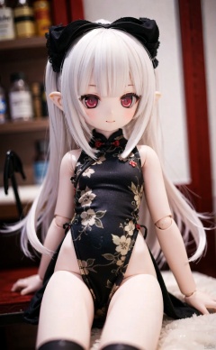 ff40745b5cMI,1girl,doll_joints,joints,tail,long_hair,red_eyes,thighhighs,white_hair,smile,chinese_clothes,demon_tail,dress,