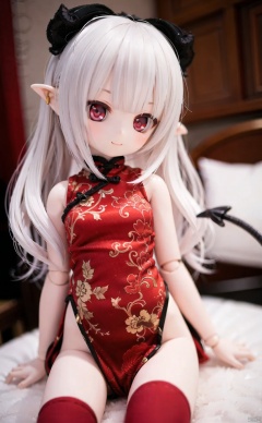 ff40745b5cMI,1girl,doll_joints,joints,tail,long_hair,red_eyes,thighhighs,white_hair,smile,chinese_clothes,demon_tail,dress,