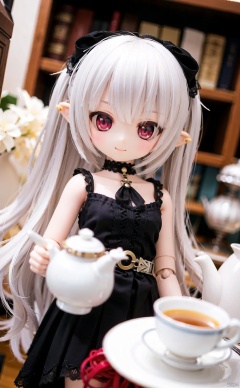 ff40745b5cMI, 1girl, tail, solo, white_hair, long_hair, red_eyes, doll_joints, smile, teapot, joints, demon_tail, cup, teacup, looking_at_viewer, blurry