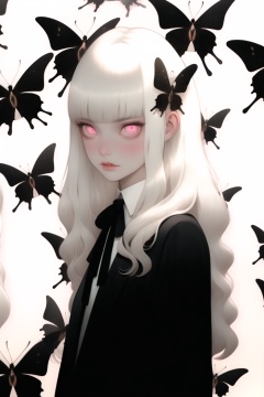 qzqzz,butterfly,bug,shirt,white hair,white shirt,long hair,looking at viewer,bangs,butterfly hair ornament,ribbon,1girl,6+girls,glowing eyes,red eyes,blunt bangs,upper body,pink eyes,glowing,parted lips,black ribbon,jacket,black jacket,neck ribbon,solo,hair ornament,<lora:qzqzz-000020:1>,, masterpiece, best quality,