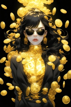 qzqzz, gold, 1girl, jewelry, long hair, solo, black hair, black background, necklace, floating hair, long sleeves, coin, bracelet, upper body, jacket, earrings, hand up, black jacket, parted lips, sunglasses, simple background, lips,<lora:qzqzz-000020:1>,, masterpiece, best quality,