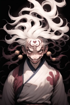 qzqzz, solo, jewelry, 1boy, earrings, looking at viewer, white hair, long hair, japanese clothes, male focus, floating hair, kimono, facial mark, upper body, smile, wide-eyed, sanpaku, black background,<lora:qzqzz-000020:1>,, masterpiece, best quality,