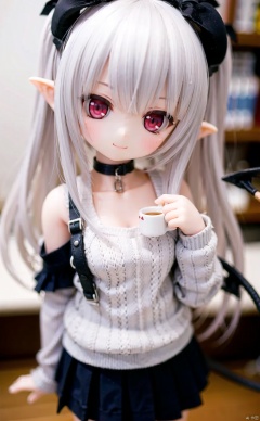 ff40745b5cMI, 1girl, tail, solo, white_hair, red_eyes, horns, demon_tail, smile, long_hair, skirt, sweater, demon_girl, bow, hair_bow, mug