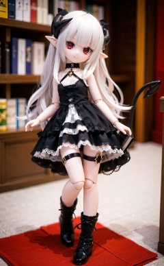 ff40745b5cMI, 1girl, solo, book, white_hair, doll_joints, dress, red_eyes, long_hair, pointy_ears, jewelry, tail, joints, pentagram, smile, horns, boots, black_dress