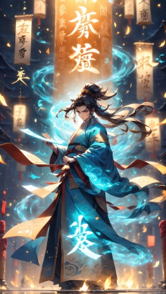 1boy, dynamic posture wearing Hanfu, long hair,Upper body, glowing text, transparent text, energy text, energy fluid, glowing, Fire, flame, flame fluid,dawn, light particle effect, floating energy scroll, blue energy, best quality, masterpiece, 8k,transparent text, negative_hand, Daofa Rune, Wen Dao Sheng Zun,Multi energy text
