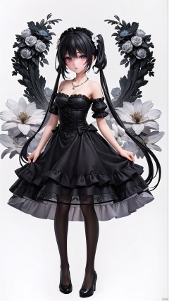 (black greyscale:1.2),(best quality),original,Perfect details,(ultra-detailed),illustration,(fantasy:1.1),(clear frame:1.1),(extremely detailed CG unity 8k wallpaper),(depth of field:0.66),(Livy Irwin),(full body:1.2333),((\\Black and White gradient color\\):1.2),(1girl:1.314),detailed face,(red eyes:1.233),(Smoky eye:1.2,dark eye circles:1.2)/=(black eyeshadow:1.34),(glowing eyes:1.133),(detailed eyes),(black hair:1.24),(very long hair),(messy hair:1.2),(low twintails, low tied:1.2),(strapless lace-trimmed lolita<Organza lace>),necklace,(light smile,closed mouth),plant,white flower,butterfly,white background,(sketch:1.35),(yubao:0.5), backlight, colors