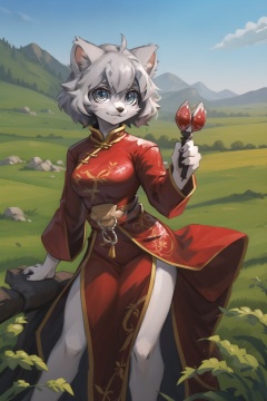 masterpiece, best quality,manul,tusun,looking at viewer, furry girl,grey hair,chinese dress, outdoors,grass,prairie <lora:Manul:0.6>