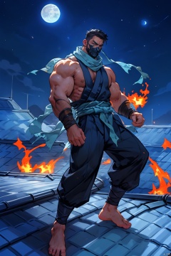 best quality, amazing quality, very aesthetic, absurdres, 1guy, male focus, a ninja fighting on rooftop, bara, full body, stubble, mature male, muscular male, barefoot, night, moon, foot wraps, buzz cut, kote , mouth mask , scarf , mist, blue fire