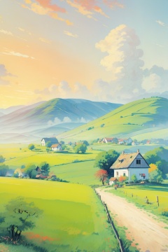 乡村, An idyllic countryside vista with undulating hills and quaint farmhouses,  in the style of poster art,  hyper-detailed,  richly colored skies,  colorful,  Oil painting,  cozy animation scenes, illustration,<lora:EMS-261620-EMS:1.000000>