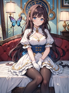 A woman in white dress sits on the bed with a butterfly on her arm,  a detailed painting,  Fan Qi,  soft lighting,  fantasy,  Kikukawa Yingzan,  sots art,  rococo,  with long hair and blue gloves,  sitting cross-legged on the bed,  Du Qiong,  pantyhose