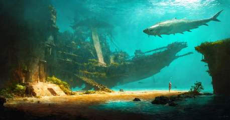 (masterpiece:1.2),best quality,high resolution,unity 8k wallpaper,(illustration:1),scenery,underwater, fish, ruins, science fiction, 1girl, very wide shot, signature, ship, watercraft, solo, air bubble
