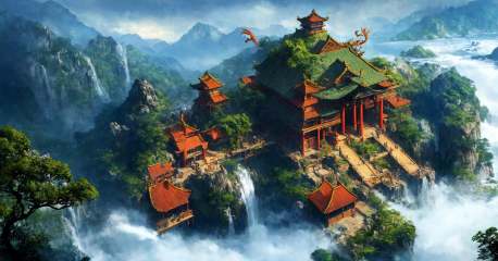 (masterpiece:1.2),best quality,high resolution,unity 8k wallpaper,(illustration:1),scenery,fog, scenery, architecture, east asian architecture, water, no humans, tree, waterfall, bridge, outdoors, dragon, glowing, mountain, giant