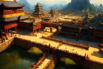 (masterpiece:1.2),best quality,high resolution,unity 8k wallpaper,(illustration:1),scenery,east asian architecture, building, bridge, no humans,city,architecture,