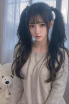 (masterpiece:1.2),best quality,high resolution,unity 8k wallpaper,(illustration:1),beautiful detailed eyes:,extremely detailed face,perfect lighting,photo_\(medium\),photorealistic,realistic,1girl, solo, black hair, thighhighs, stuffed toy, twintails, stuffed animal, long hair, realistic, white thighhighs, sweater, kneeling, curtains,