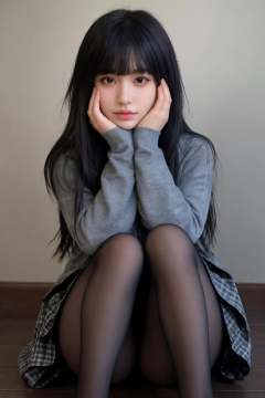 (masterpiece:1.2),best quality,high resolution,unity 8k wallpaper,(illustration:1),beautiful detailed eyes:,extremely detailed face,perfect lighting,photo_\(medium\),photorealistic,realistic,1girl, solo, black hair, phone, skirt, pantyhose, holding phone, long hair, cellphone, holding, on floor, realistic, bangs, feet, smartphone, sitting, selfie, lips, no shoes, hand on own face, sweater, plaid, plaid skirt, long sleeves, blunt bangs, full body, wooden floor, toes, legs