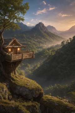 (masterpiece:1.2),best quality,high resolution,unity 8k wallpaper,(illustration:1),perfect lighting,photo_\(medium\),photorealistic,realistic,<lyco:GoodHands-beta2:1>,valley, fairytale treehouse village covered, , matte painting, highly detailed, dynamic lighting, cinematic, realism, realistic, photo real, sunset, detailed, high contrast, denoised, centered, michael whelan, 8k, detailed, hyper realistic,
