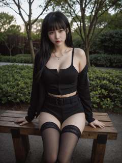 (masterpiece:1.3),best quality,high resolution,unity 8k wallpaper,(illustration:1),perfect lighting,photo_\(medium\),photorealistic,realistic,<lora:GoodHands-vanilla:1>finely detail,extremely detailed,soft lighting and shadow,soft yet striking lighting,film grain:1.2,1girl, thighhighs, solo, long hair, shorts, sitting, black thighhighs, outdoors, necklace, looking at viewer, black hair, jacket, belt, tree, jewelry, black jacket, shirt, denim, midriff, shoulder cutout, black shorts, short shorts, black shirt, bangs, bench