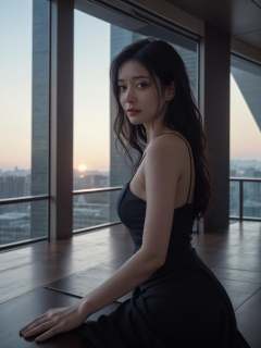 (masterpiece:1.3),best quality,high resolution,unity 8k wallpaper,(illustration:1),perfect lighting,photo_\(medium\),photorealistic,realistic,<lora:GoodHands-vanilla:1>finely detail,extremely detailed,soft lighting and shadow,soft yet striking lighting,film grain:1.2,nataliadyer, youthful, cute, long straight hair, vogue, harpers bazaar, wearing an elegant dark blue dress, on top of a skyscraper observation deck, at sunset, detailed face, good anatomy, modelshoot style, masterpiece, photo, closeup portrait, facing forward, shot by annie liebovitz,