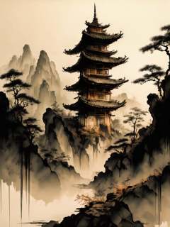 best quality, high resolution, unity 8k wallpaper, (illustration:1.0),<lora:shuimo_v1:0.9>,chinese_style,tower,sky,