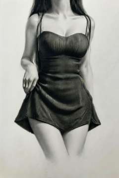 sketch, 1girl, solo, monochrome, greyscale, long hair, dress, traditional media, breasts, head out of frame, clothes lift, bare shoulders, short dress, cleavage, medium breasts,<lora:GoodHands-vanilla:1>,best quality,high resolution,unity 8k wallpaper,photo_\(medium\),<lora:sumiao-000026:0.75>,