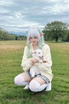 (masterpiece:1.3),best quality,high resolution,unity 8k wallpaper,(illustration:1),perfect lighting,photo_\(medium\),photorealistic,realistic,<lora:GoodHands-vanilla:1>,finely detail,extremely detailed,soft lighting and shadow,soft yet striking lighting,film grain:1.2,<lora:naxida-000009:0.65>,nahida \(genshin impact\),1girl,outdoors,closed eyes,pointy ears,skirt,multicolored hair,white hair,animal,grass,day,long hair,virtual youtuber,thighhighs,gradient hair,plaid skirt,cardigan,solo,sky,cloud,smile,hair ornament,plaid,white thighhighs,over-kneehighs,long sleeves,green hair,kneehighs,sheep,socks,sitting,closed mouth,petting,holding animal,squatting,bangs,holding,yellow cardigan,elf,
