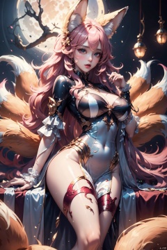 Master masterpiece, top CG rendering, studio quality, highest picture quality, ultra clear, look up, (((nine-tail Fox))), long pink hair, delicate fox ears, soft hair, delicate features, clear face, ((blushingly red face)), clear eyes, long eyelashes, clear pupils, real lips with shine, light makeup, hot body, Sexy, ruddy skin, plump breasts, sexy long legs, ((glossy silky dress all over)), (sculpted silk dress moist and glossy)), realistic, (((nine long pink fox tails)), recent, moon, rendered to perfection, realistic, true textures, true photos, cinematography, high quality, studio lighting, Top light, side backlight, backlight, telephoto, Depth of field, large depth of field, ultra sharp, 8k quality, ultra fine comics, fine lines, 1girl