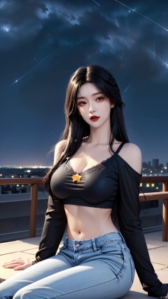 1girl, jiangli, breasts, denim, black hair, solo, pants, jeans, looking at viewer, navel, night, long hair, large breasts, red lips, sky, black bra, bra, outdoors, cleavage, sitting, midriff, makeup, night sky, underwear, brown eyes, arm support, lipstick, star \(sky\), city lights, starry sky, bare shoulders, long sleeves, mole