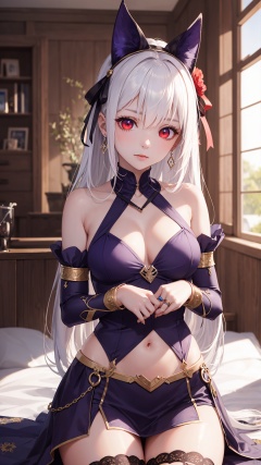 fgokama,  kama,  hair ribbon,  (red eyes:1.5),  red ribbon,  ribbon,  long hair,  white hair,  BREAK armlet,  bare shoulders,  bikini armor,  bracelet,  collar,  detached sleeves,  dress,  earrings,  floral print,  jewelry,  metal collar,  miniskirt,  pelvic curtain,  purple dress,  purple skirt,  purple sleeves,  purple thighhighs,  ring,  skirt,  thighhighs,  thighlet,  BREAK looking at viewer,  BREAK indoors,  bed BREAK (masterpiece:1.2),  best quality,  high resolution,  unity 8k wallpaper,  (illustration:0.8),  (beautiful detailed eyes:1.6),  extremely detailed face,  perfect lighting,  extremely detailed CG,  (perfect hands,  perfect anatomy),<lora:EMS-67170-EMS:0.000000>,<lora:EMS-253410-EMS:0.000000>,<lora:EMS-89019-EMS:0.000000>,<lora:EMS-151900-EMS:0.000000>,<lora:EMS-70958-EMS:0.000000>