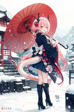 -dragon girl, 1girl, oil-paper umbrella, solo, umbrella, dragon tail, long hair, horns, tail, pink hair, braid, boots, dragon girl, dragon horns, looking at viewer, snow, architecture, standing, looking back, east asian architecture, ribbon, japanese clothes, outdoors, wide sleeves, red eyes, long sleeves, black footwear, full body, scales, bangs, high heels, high heel boots, hair ribbon, holding umbrella, from behind, skirt, black ribbon, stairs, snowing<lora:dragon girl_20240110103648-000018:0.8>,