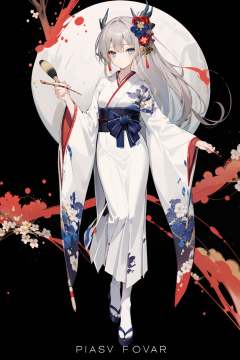 (masterpiece:1.2),best quality,PIXIV,dragon girl, 1girl, solo, paintbrush, ink, flower, hair ornament, hair flower, japanese clothes, looking at viewer, holding, branch, red flower, grey hair, kimono, standing, blue eyes, full body, bangs, holding paintbrush, long sleeves, floral print, white background, dragon, hakama, grey eyes, calligraphy brush, long hair, closed mouth, skirt, hakama skirt, simple background, blood, holding brush<lora:dragon girl_20240110103648:0.8>,