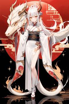 -dragon girl,eastern dragon,1girl,dragon,hanfu,long hair,wide sleeves,white hair,long sleeves,chinese clothes,sash,sparkle,scales,standing,bangs,closed mouth,hair ornament,full body,solo,looking at viewer,horns,shawl,dress,hagoromo,<lora:dragon girl_20240110103648:0.8>,