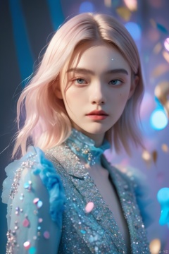 a woman looking picture of confetti, inspired by Yanjun Cheng, futuristic fashion show, blue color grading, elle fanning), aleksander rostov, incredibly ethereal, marat zakirov, stålenhag, sharpfocus, official valentino editorial, with dramatic lighting, fadeev 8 k, aurora aksnes and zendaya, 1girl