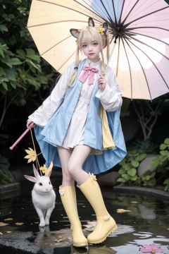 1girl, rainbow, raincoat, yellow raincoat, rubber boots, hydrangea, flower, long hair, twintails, boots, blush, umbrella, open mouth, hair ornament, white background, hood, solo, teruterubouzu, very long hair, hood up, long sleeves, low twintails, bow, bangs, smile, animal hood, blue eyes, rabbit, closed umbrella, puddle, full body, :d, snail, yellow footwear, simple background, pink flower, standing, leaf umbrella, holding umbrella, food-themed hair ornament, hair bow, animal ears, holding, blonde hair, hair flower, rain, animal