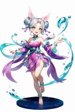 HEZI,Fantasy westward Journey,Chinese style,chivalry,ancient costume,1girl,solo,barefoot,smile,white background,open mouth,double bun,hair bun,dress,jewelry,bracelet,teeth,simple background,looking at viewer,bare shoulders,:d,long hair,bangs,full body,hair ornament,upper teeth only,detached sleeves,anklet,parted bangs,green eyes,shiny,wide sleeves,shiny hair,pink dress,purple dress,grey hair,bangle,collarbone,blush,aqua eyes,standing,bare legs,hand up,white hair,very long hair,breasts,choker,detached collar,toes,strapless dress,feet,sidelocks,arm up,strapless,<lora:中国风人物设计-000006:0.7>,