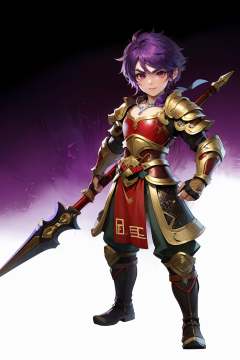 HEZI,Fantasy westward Journey, Chinese style, chivalry, ancient costume, solo, 1boy, male focus, purple hair, gloves, white background, full body, fingerless gloves, purple eyes, simple background, staff, looking at viewer, armor, smile, standing, weapon, clenched hand, jewelry, holding, boots, necklace, red eyes, pants, shoulder armor, pink eyes, pectorals, short hair, thick eyebrows<lora:中国风人物设计-000006:0.7>,