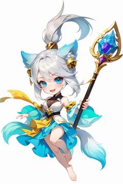 HEZI,Fantasy westward Journey,Chinese style,chivalry,ancient costume,1girl,fox ears,animal ears,solo,ahri \(league of legends\),fox tail,tail,long hair,chibi,smile,bell,open mouth,hair ornament,bare shoulders,staff,transparent background,teeth,barefoot,blue eyes,simple background,facial mark,full body,hair bun,:d,looking at viewer,white hair,upper teeth only,white background,single hair bun,alternate hair color,dress,detached sleeves,holding,fox girl,bangs,grey hair,whisker markings,fang,blush,yordle,ponytail,breasts,white dress,fangs,ribbon,holding staff,<lora:中国风人物设计-000006:0.7>,