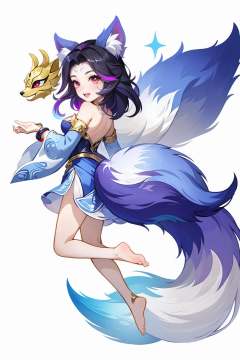HEZI,Fantasy westward Journey, Chinese style, chivalry, ancient costume, 1girl, fox tail, fox ears, tail, long hair, solo, bangs, smile, animal ears, white background, black hair, simple background, barefoot, looking at viewer, bare shoulders, dress, ahri \(league of legends\), red eyes, parted bangs, fox girl, jewelry, from side, multiple tails, full body, detached sleeves, breasts, blue dress, mask, multicolored hair, facial mark, official alternate costume, bracelet, two-tone hair, shiny hair, floating, shiny, :d, looking back, long sleeves, sparkle, mask on head, kitsune, hair ornament, pink eyes, strapless dress, medium breasts, blush, hand up, closed mouth, teeth, strapless, animal ear fluff, purple hair, fox, looking to the side, open mouth, parted lips, whisker markings,<lora:中国风人物设计-000006:0.7>,