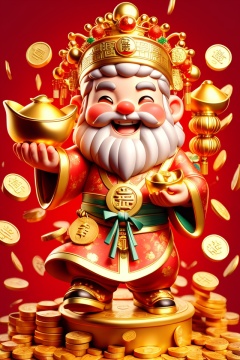 God of wealth, full body, lots of gold coins falling, gold coins shining, festive atmosphere, solo, blush, smile, smiling eyes, male focus, wide sleeves, beard, hat, Chinese dress, crown, beard, 3D modeling and rendering, high definition, detail enhancement,facai